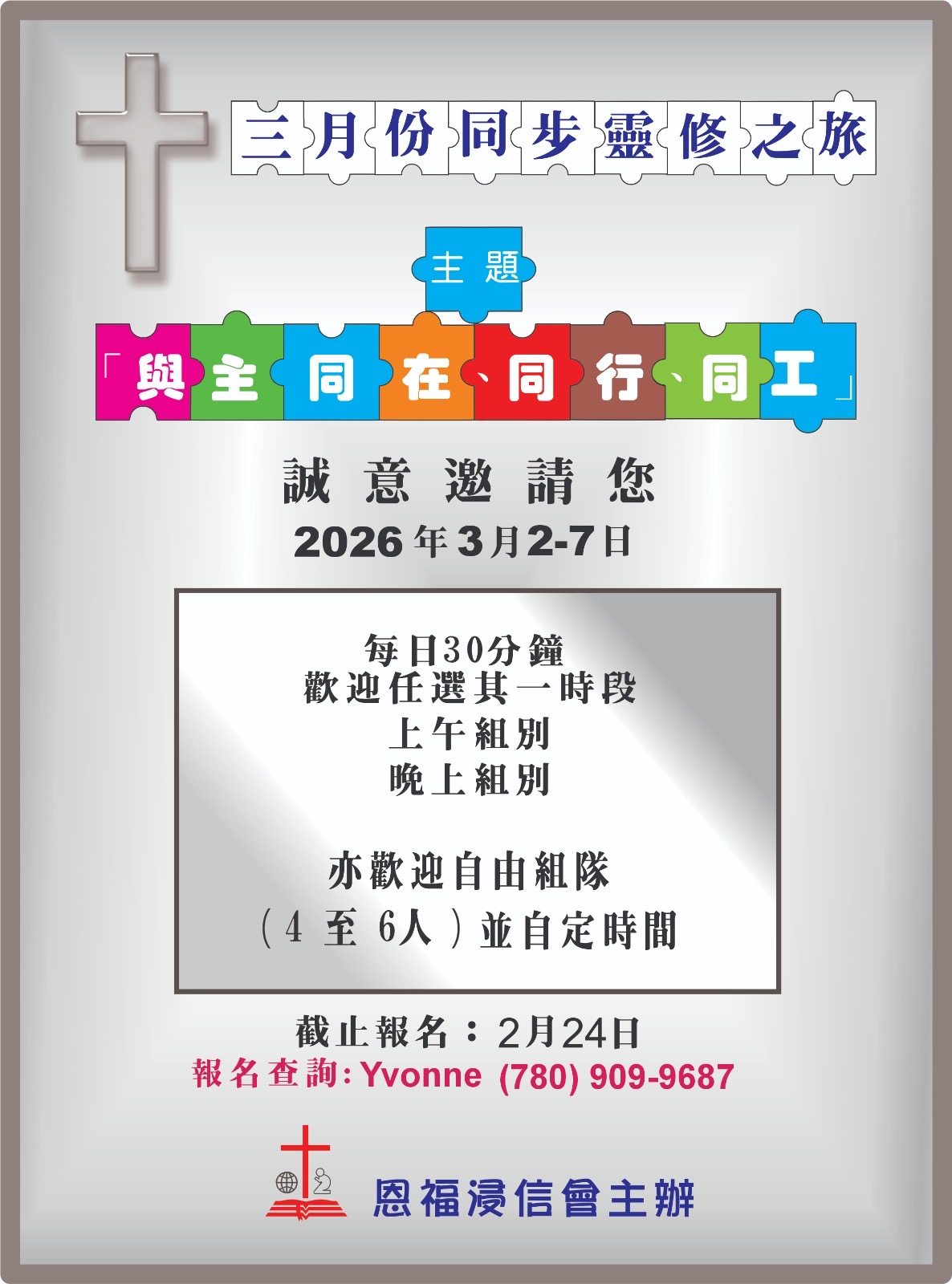 ◆ 「同步靈修」之旅 三月份「同步靈修」之旅將於 3月2-7日舉行。主題:「與主同在、同行、同工」,每日30分鐘,歡迎任選上午或晚上組別,亦歡迎自由組隊 (4-6人), 並自定時間,截止報名:2月24日,查詢及報名請聯絡Yvonne 姊妹。